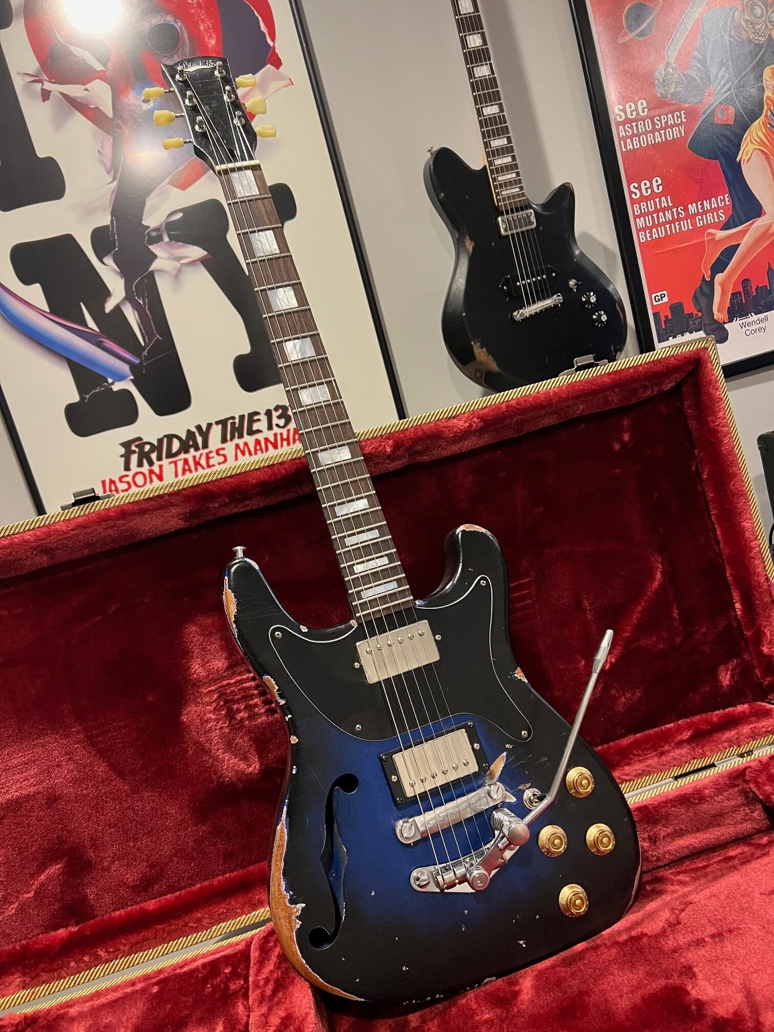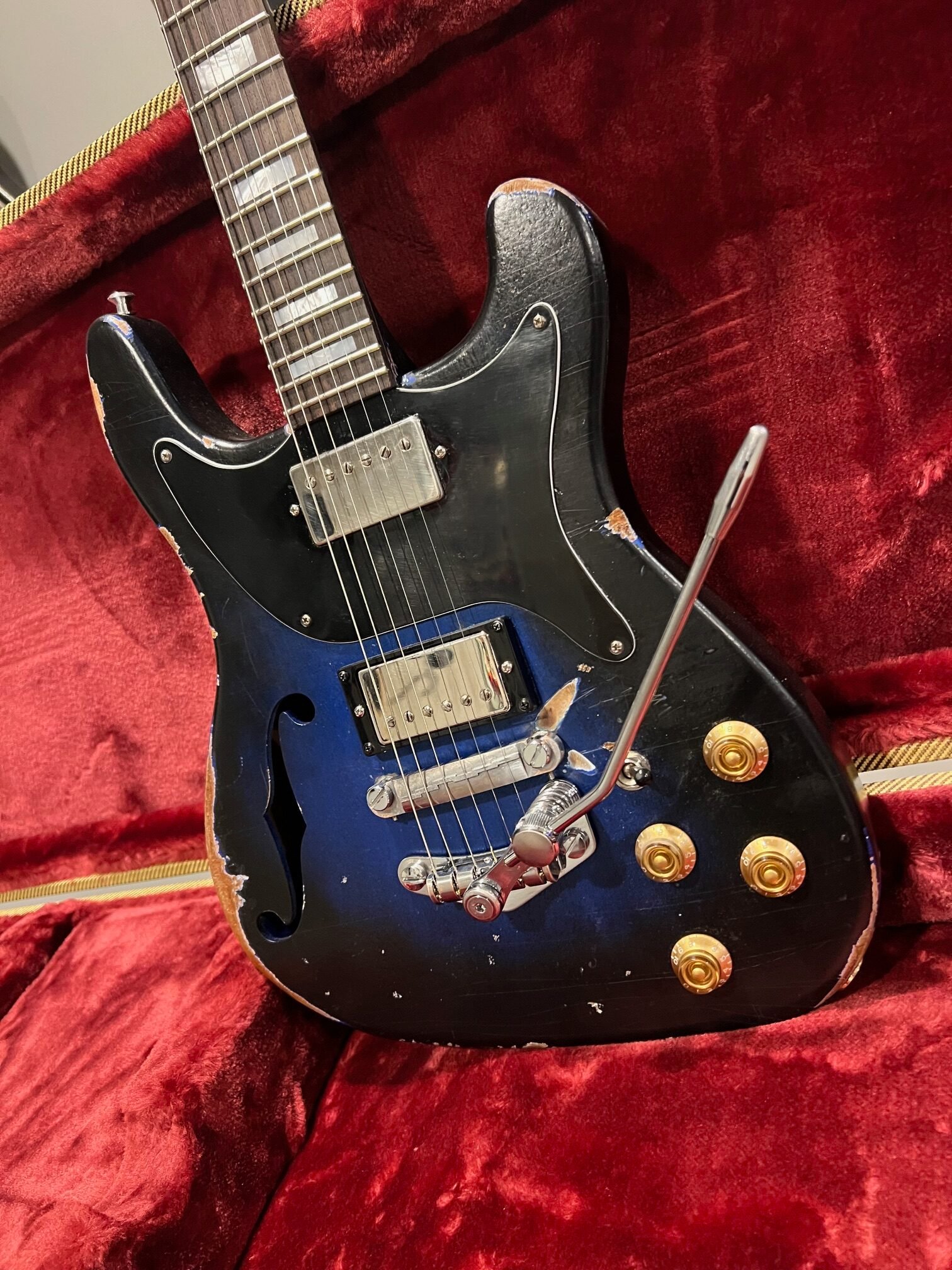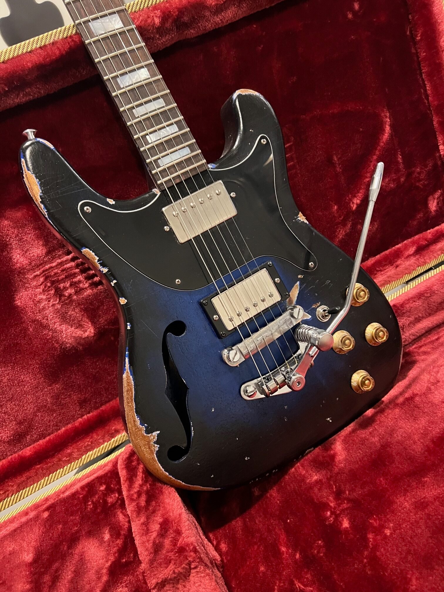 Mahogany semi-hollow body with a black and blue distressed finish