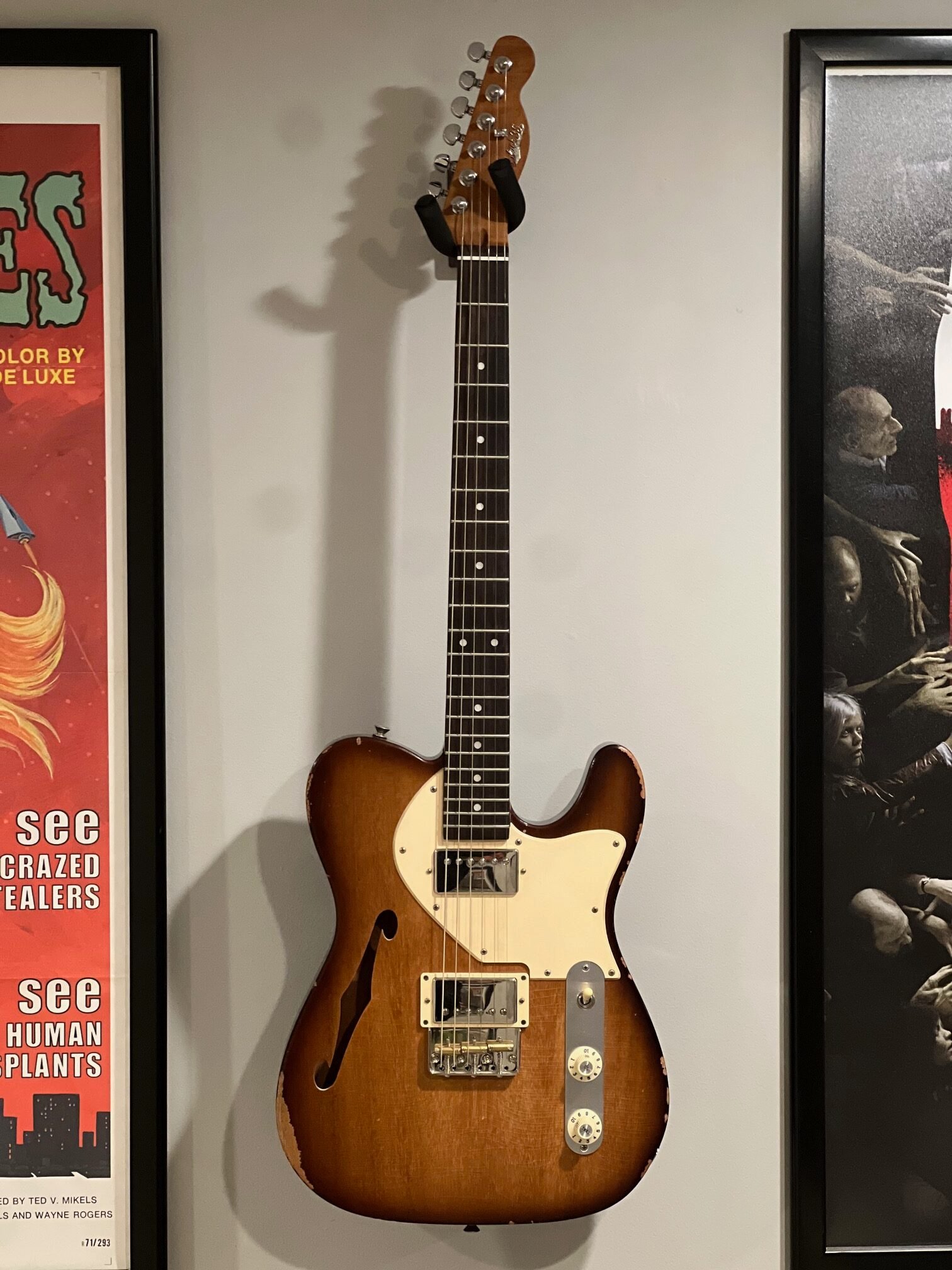 This one-off BLK35 Sunburst Thinline Tele-style guitar features a resonant mahogany body with tasteful medium aging and beautiful finish checking. Versatile and expressive, it’s loaded with premium DiMarzio pickups and classic, straightforward controls.