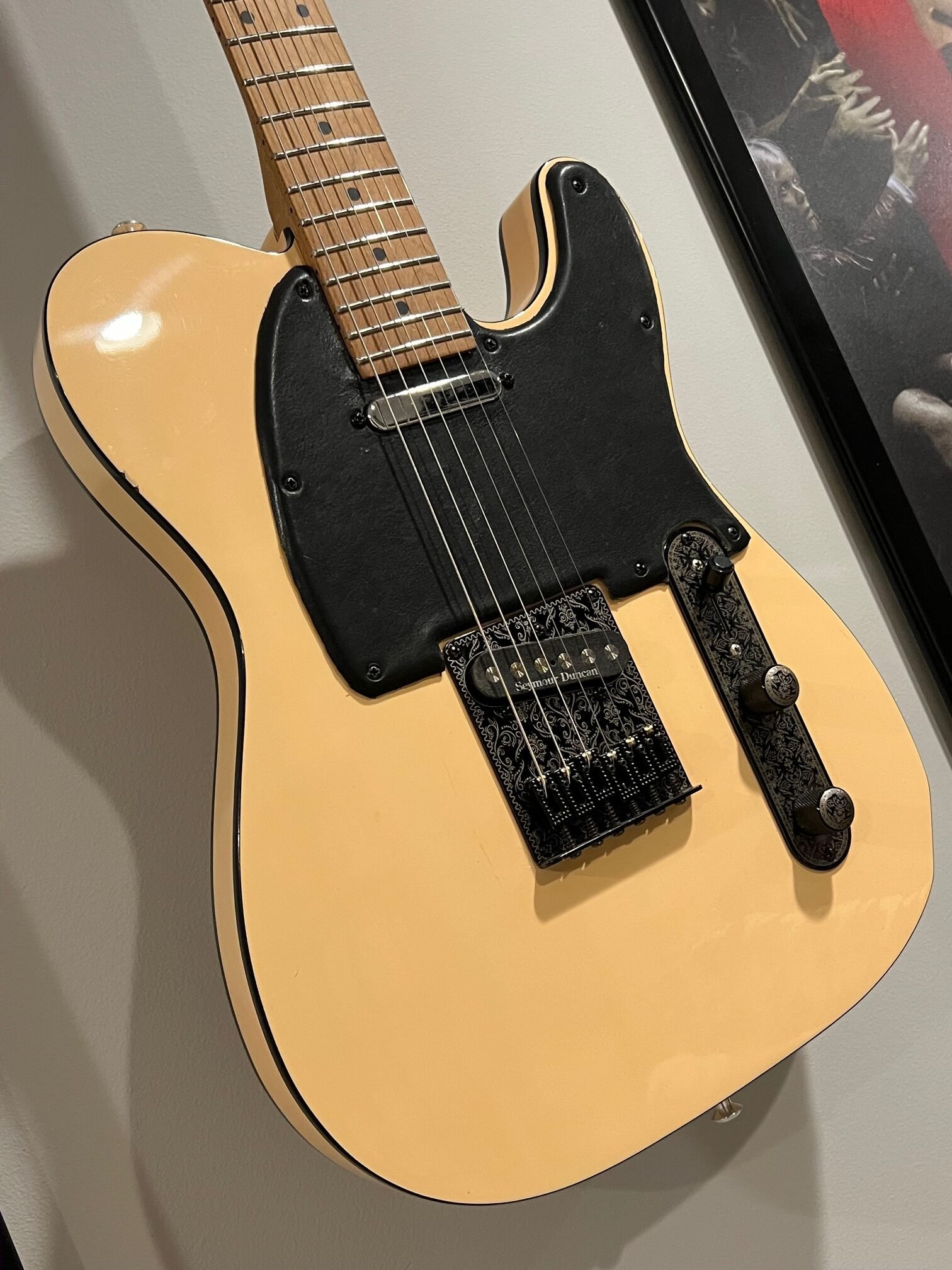This one-off BLK35 “Tuxedo” Tele-style guitar features a solid alder body with a clean, reversed crème aesthetic. No aging or distressing here—this one’s a blank canvas, ready for you to put your own miles on it. Outfitted with Seymour Duncan pickups and classic Tele controls, it delivers punch, clarity, and vintage-leaning versatility.